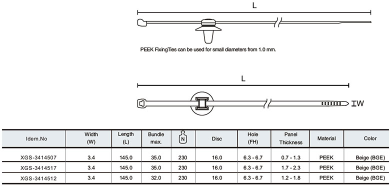 Primarily designed for ?xing cable harnesses in the automotive industry, their simplicity and ease of use has resulted in these parts being used in other industries, for example aviation, switch gear and white goods manufacturing. Features and Bene?ts: 1.Pre-assembled 2-piece ?xing tie with arrowhead foot part. 2.Cable tie head can be moved after bundling. 3.Easy to assemble without the need for a tool. 4.Arrowhead simply locks into place. 5.Disc adjusts tie for pressure from various directions and minimises access of dust, dirt and water. 6.Manufactured in PEEK material. 7.-55 °C to +240 °C operating temperature. 8.Excellent resistance against chemicals and gamma radiation.
